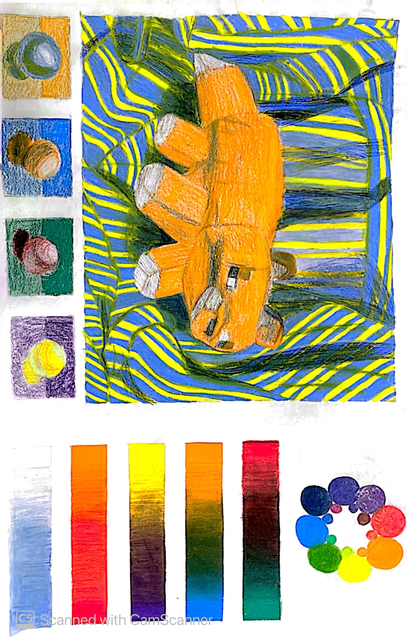 For this project, I applied color to all the drawing fundamentals I developed throughout the semester in Drawing I. I began by setting up my own still life using a Minecraft fox stuffed animal. My composition reflects my understanding of complementary colors, both in the overall color scheme and in the subtle shading techniques; the background colors are complementary to the color of the subject. This piece also demonstrates my ability to combine technical drawing skills with a thoughtful exploration of color theory.